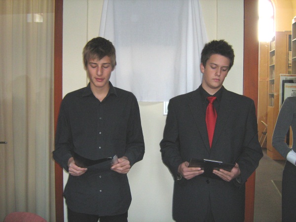 Két tanuló az 1956-os forradalomban elesett diákról szóló írást olvas fel