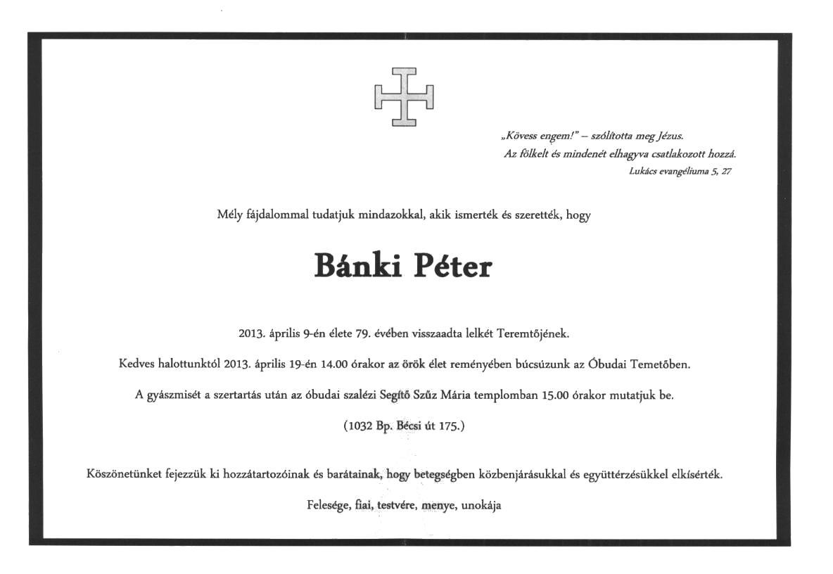 Bánki Péter (é. 1952. IV.b., † 2013.04.09.) |