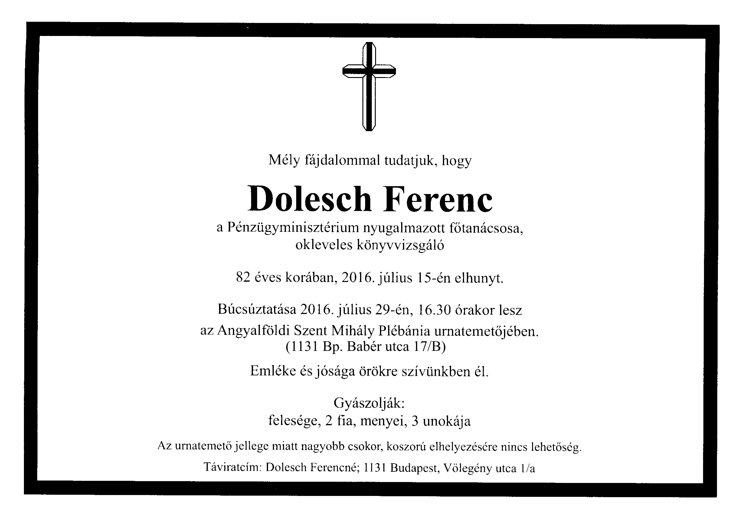 Dolesch Ferenc (é. 1952 IV.c † 2016.06.15) |
