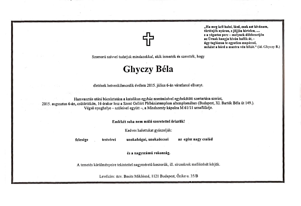Ghyczy Béla (é. 1955. IV.b. † 2015.07.06) |
