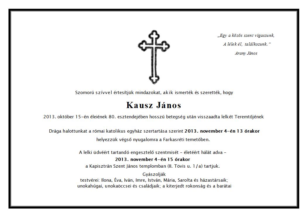 Kausz János (é. 1952 IV.b. † 2013.10.15.) |