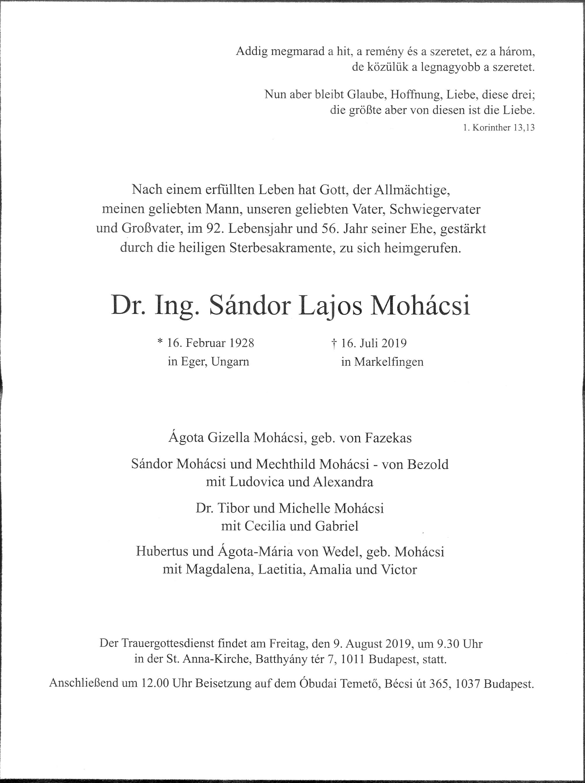 Dr. Mohácsi Sándor (é. 1946 † 2019.07.16) |