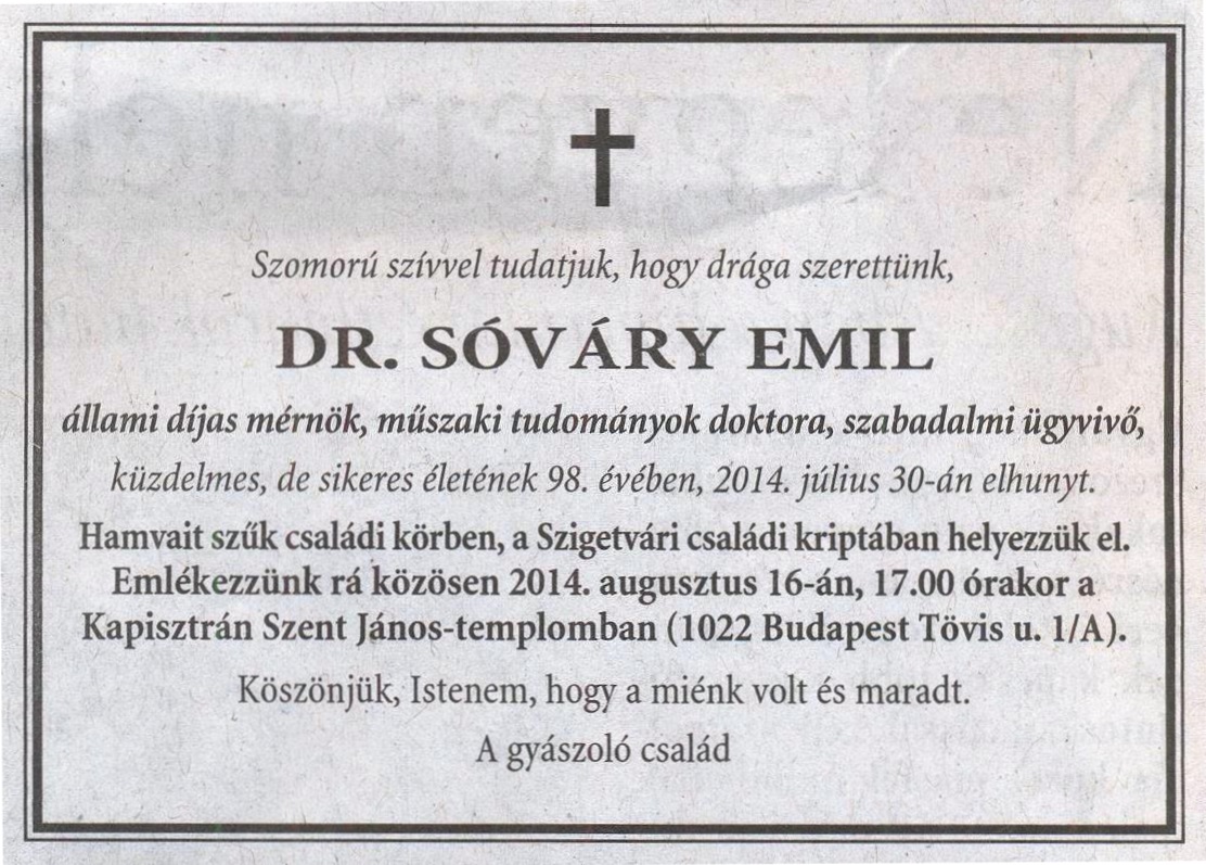 Dr. Sóváry Emil (é. 1934 † 2014.08.16.)) |