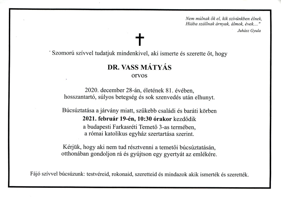 Dr. Vass Mátyás (é. 1958 IV.c † 2020.12.28.) |