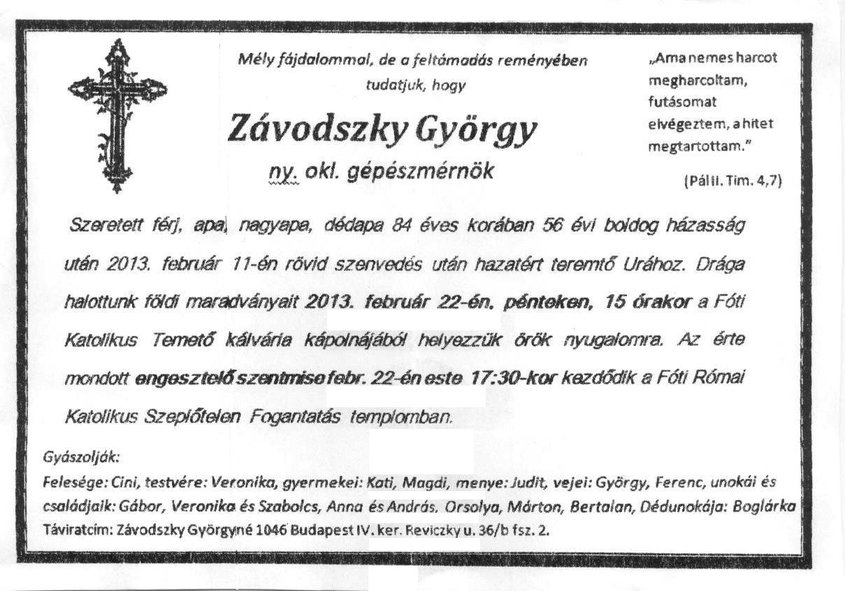 Závodszky György (é. Érseki 1946, † 2013.02.11.) |